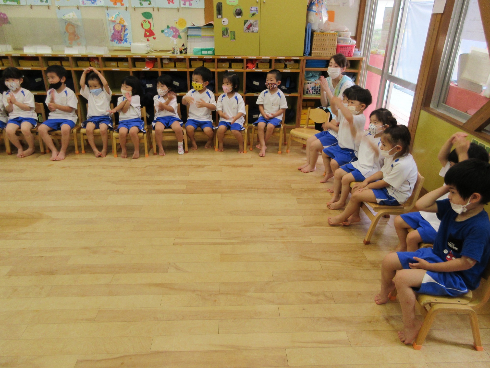 年中・年長組に分かれて楽しく体を動かすことが出来ました。(^▽^)